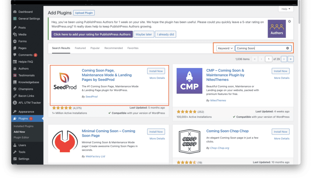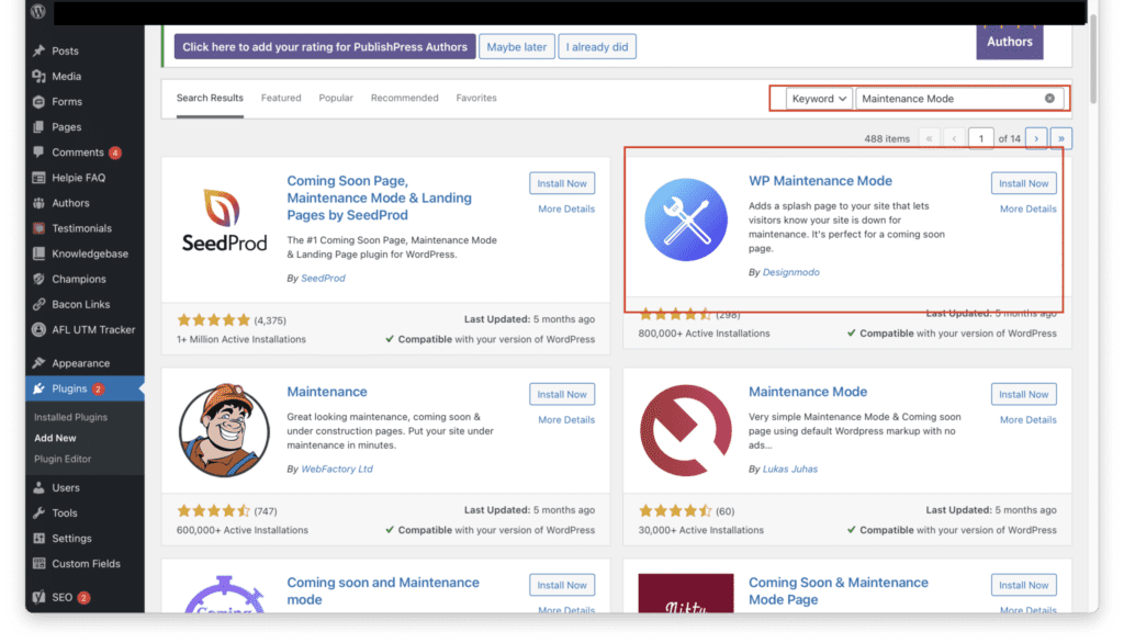 Follow similar steps as above for finding and installing the WP Maintenance Mode plugin from your WordPress Dashboard.