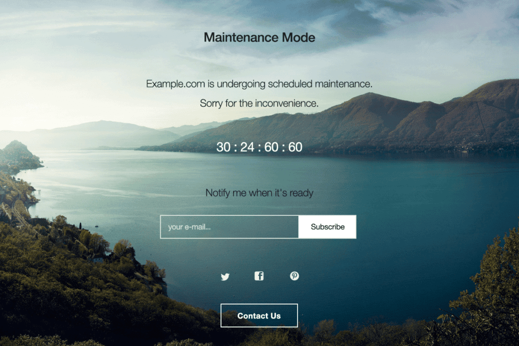For creating branded maintenance mode pages, templates are fully customizable. A countdown timer notifies visitors when your site will be available again, and a subscription form collects visitors’ email addresses to notify them when the site is available.