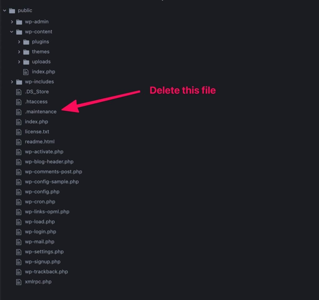To resolve this error, log into your site and use a file transfer protocol (FTP) programme to locate and delete the “.maintenance” file in your site’s root folder. If deleting the file does not resolve the problem, you may need to rerun the last update that occurred before your site went into maintenance mode to ensure the update was successful.
